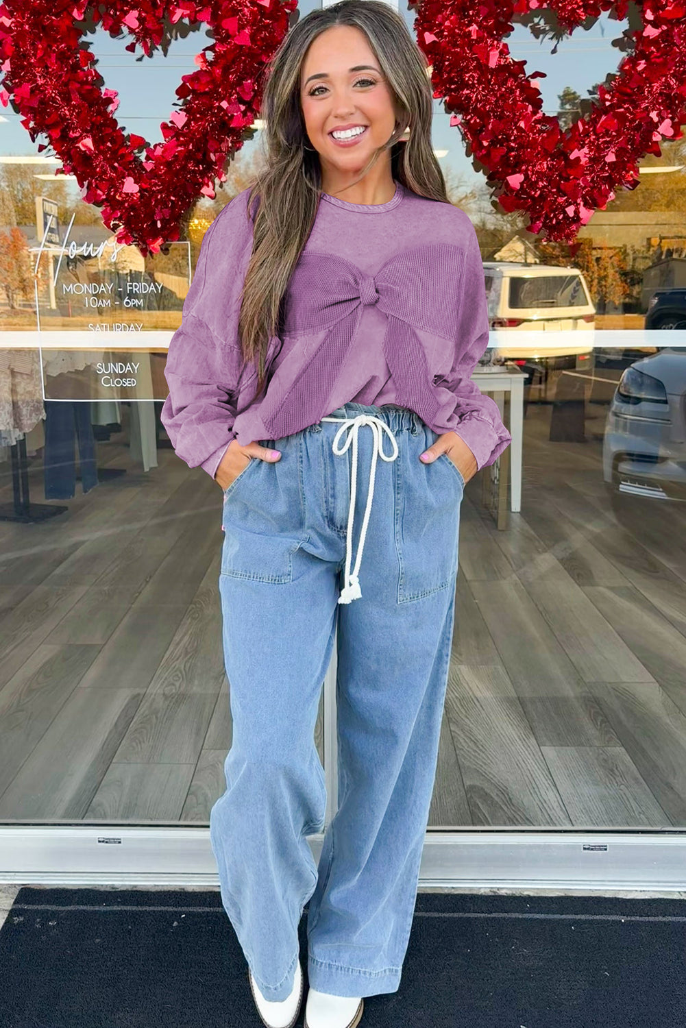 Orchid Bouquet Mineral Wash Waffle Bow Patched Pullover Sweatshirt