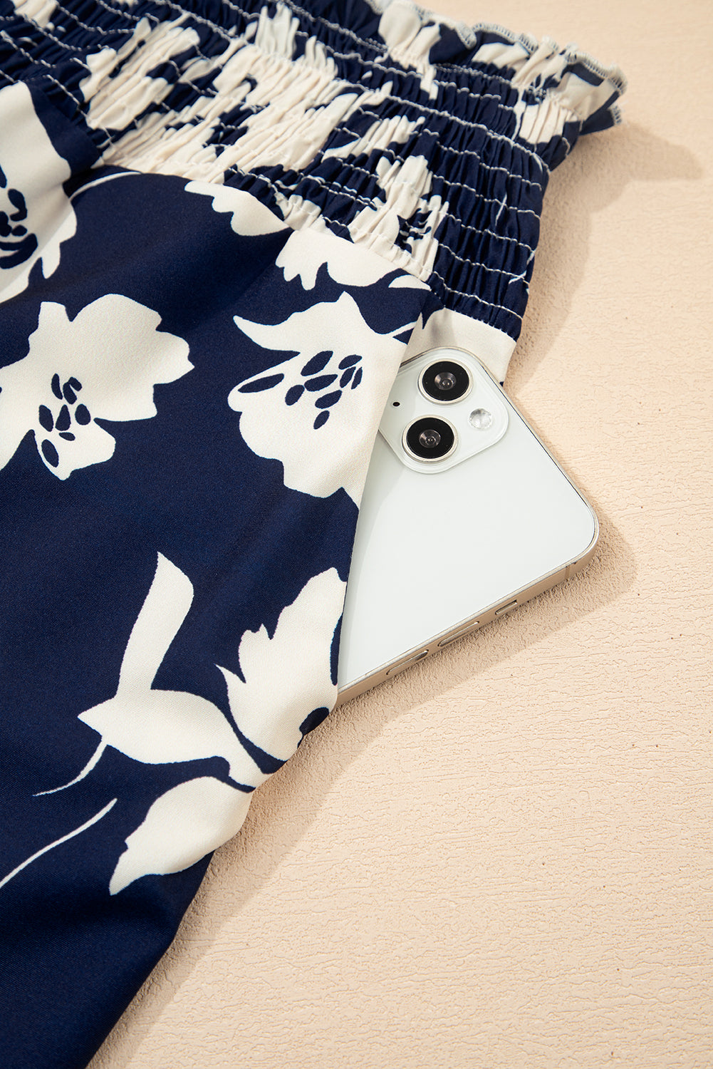 Blue Floral Smocked Frill Waist Wide Leg Pants