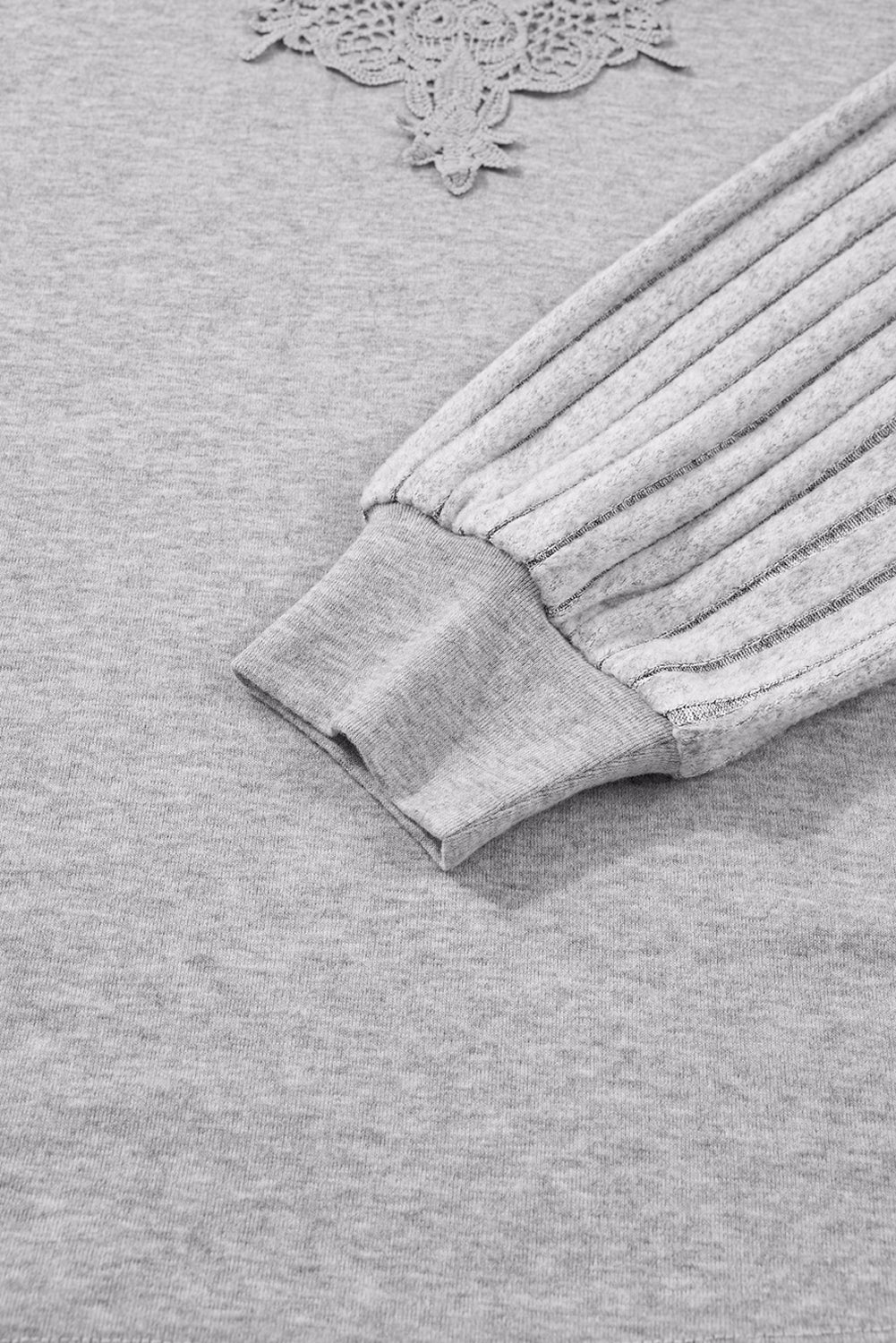 Gray Solid Lace Applique Round Neck Long Sleeve Top